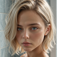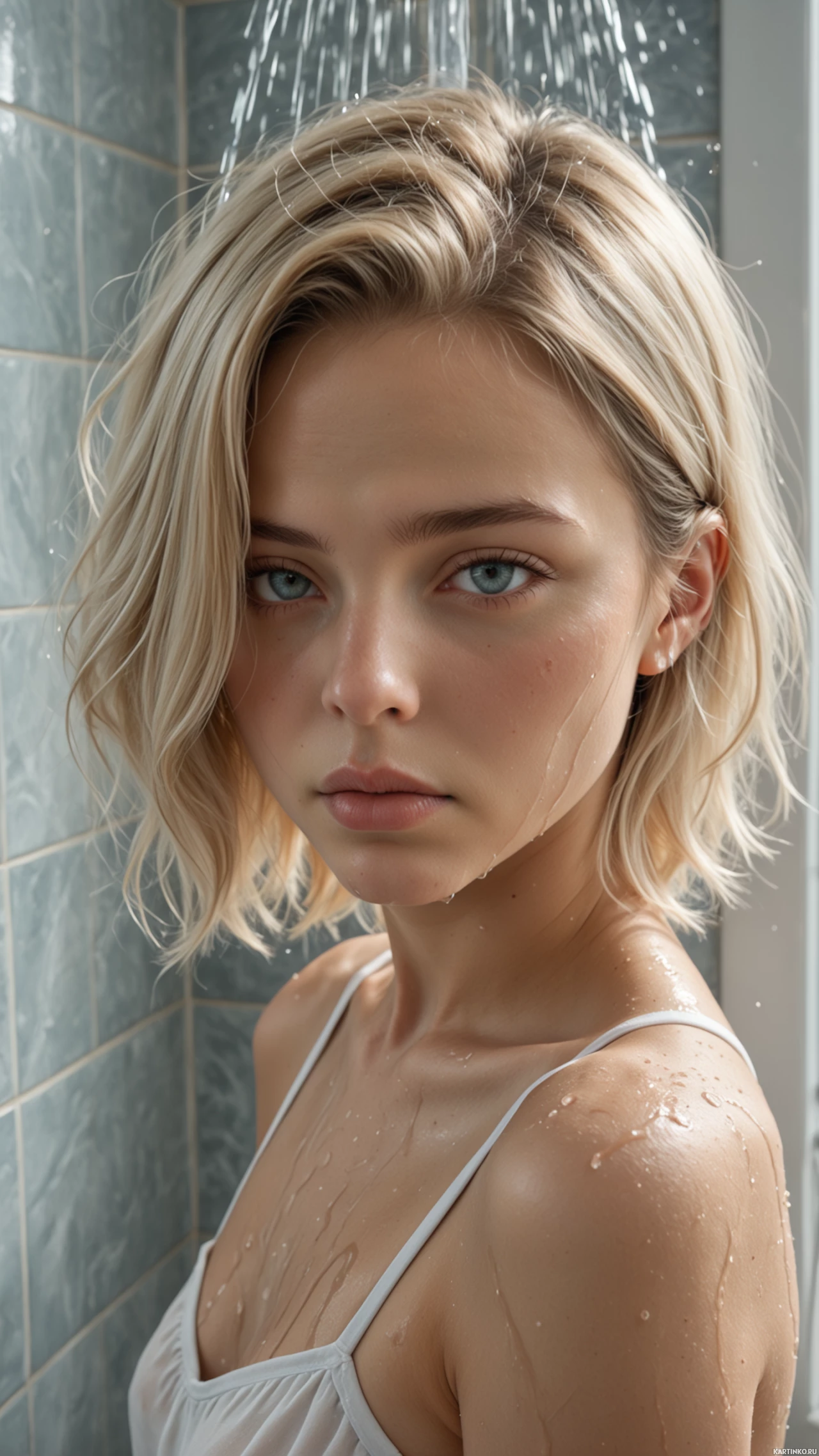 water droplets on her skin, indicating she has been in the shower. Her expression is neutral, and there's