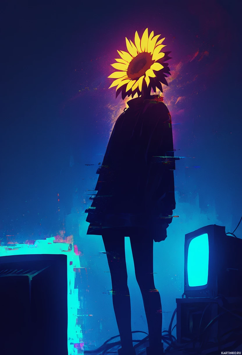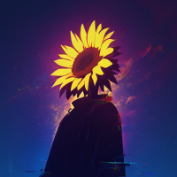 dark tones like black and blue, contrasting with the bright yellow and orange hues of the sunflower-like entity.