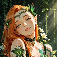 green accents that could suggest some sort of magical or fantastical nature. Her eyes are closed and she's holding her chin with one hand, giving off