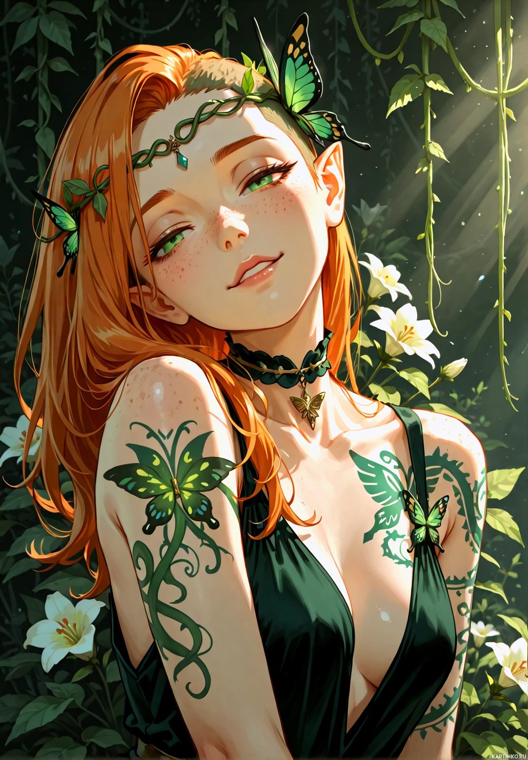 red hair, who appears to be an elf based on the common fantasy archetype. She has a delicate and ethereal look, with