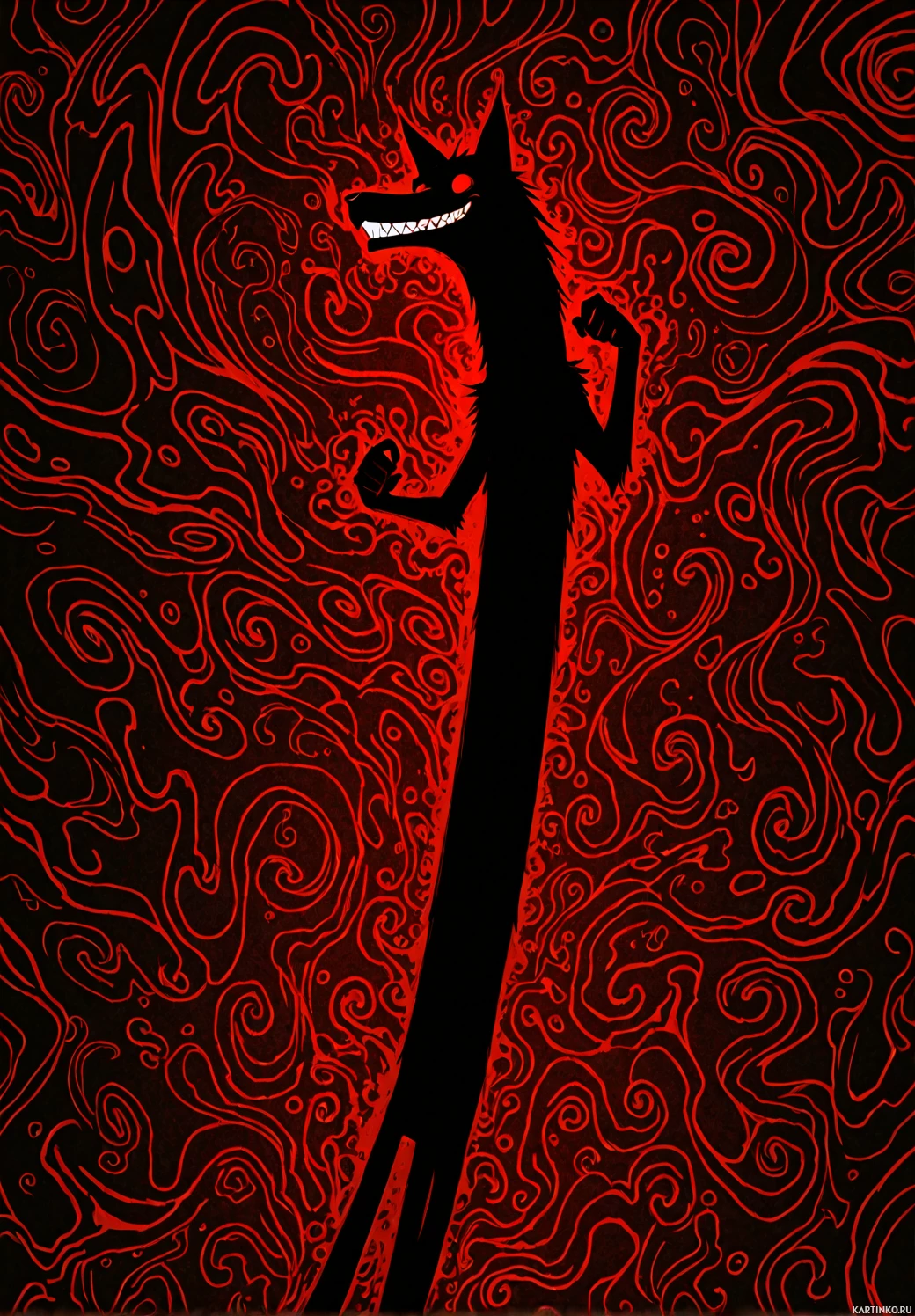 swirling patterns in darker tones, which could suggest movement or energy surrounding the wolf figure. The color palette is dominated by shades of black, red, and gray, creating a moody and intense atmosphere.