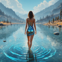 lush greenery surrounding the water's edge, and there are trees in the background. The overall style of the image could be described as a digital illustration or artwork designed to evoke