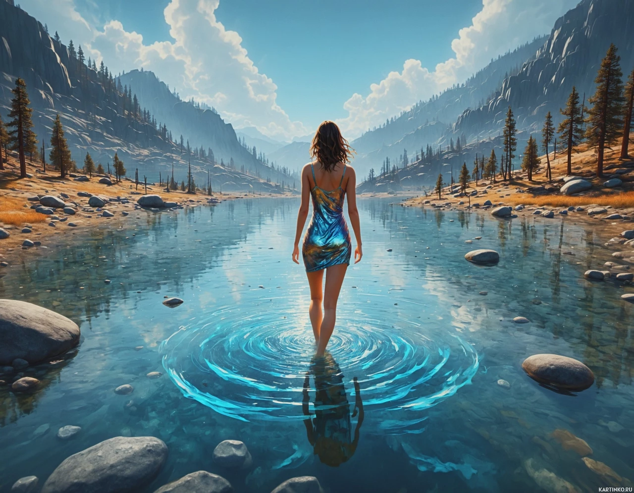 a young woman standing in a clear, blue body of water. She is positioned with her back to the viewer, and she appears to be looking at something beyond the frame of the image. Her attire suggests she might be wearing swimwear or a bodysuit suitable for