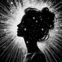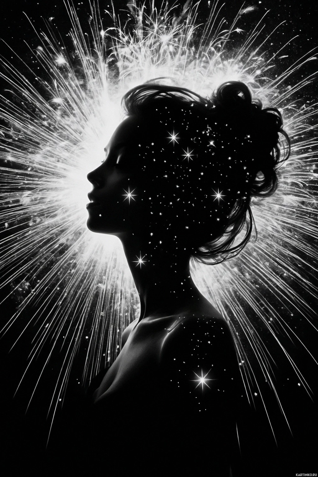 a cosmic explosion or burst of stars and sparkles. This adds an element of dynamism and could be interpreted as the woman being in harmony with the universe or embodying a powerful