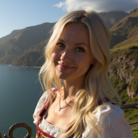 The image shows a woman standing on a scenic overlook with a mountainous landscape behind her. She has long blonde hair and is smiling at the camera, looking towards it while posing for the photo. She appears to be wearing traditional Bavarian clothing commonly associated with Oktoberfest or Alpine festivals. The lake in front of her reflects part of the sky and the surrounding hills. There's a metal object resembling a bell in the bottom left corner, which might suggest she is standing near a historic site or landmark.