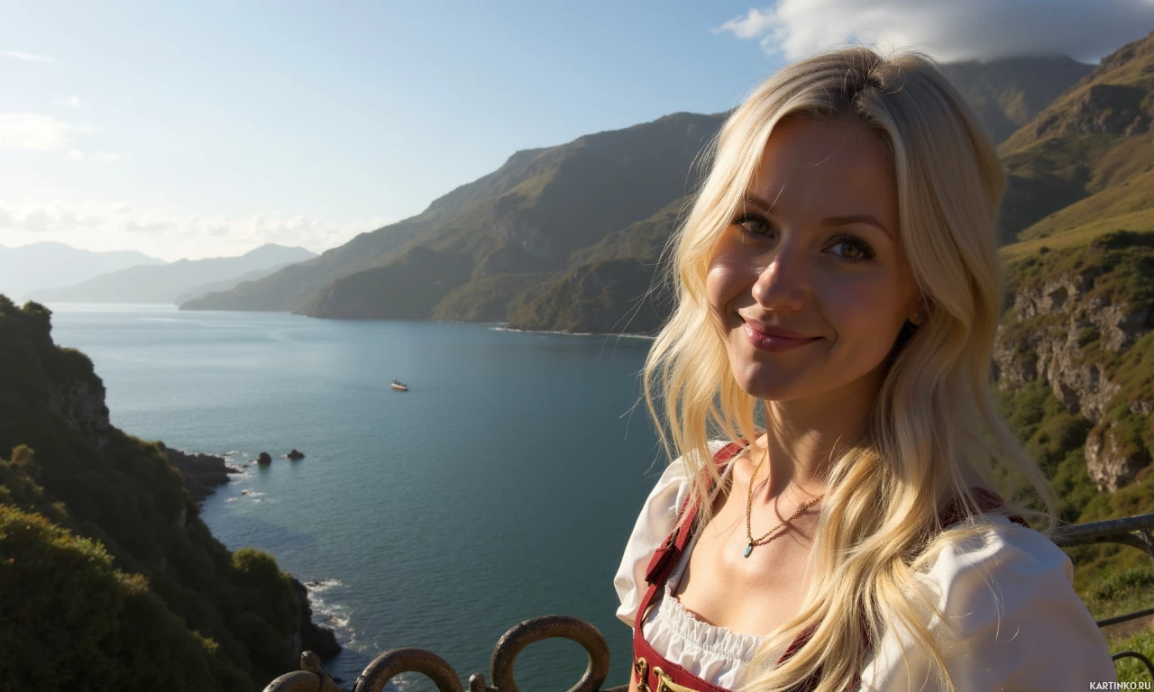 На картинке изображена женщина, стоящая на живописном смотровом майданчике с видом на горы. У неё длинные светлые волосы, и она улыбается, глядя прямо в камеру, позируя для фотографии. Судя по одежде, она одета в традиционный баварский наряд, который часто ассоциируется с Октоберфестом или альпийскими праздниками. Озеро перед ней отражает часть неба и окружающие холмы. В левом нижнем углу виден металлический предмет, похожий на колокол, что может указывать на то, что она стоит возле исторического места или достопримечательности.