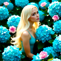 a young woman with long blonde hair. She is standing among