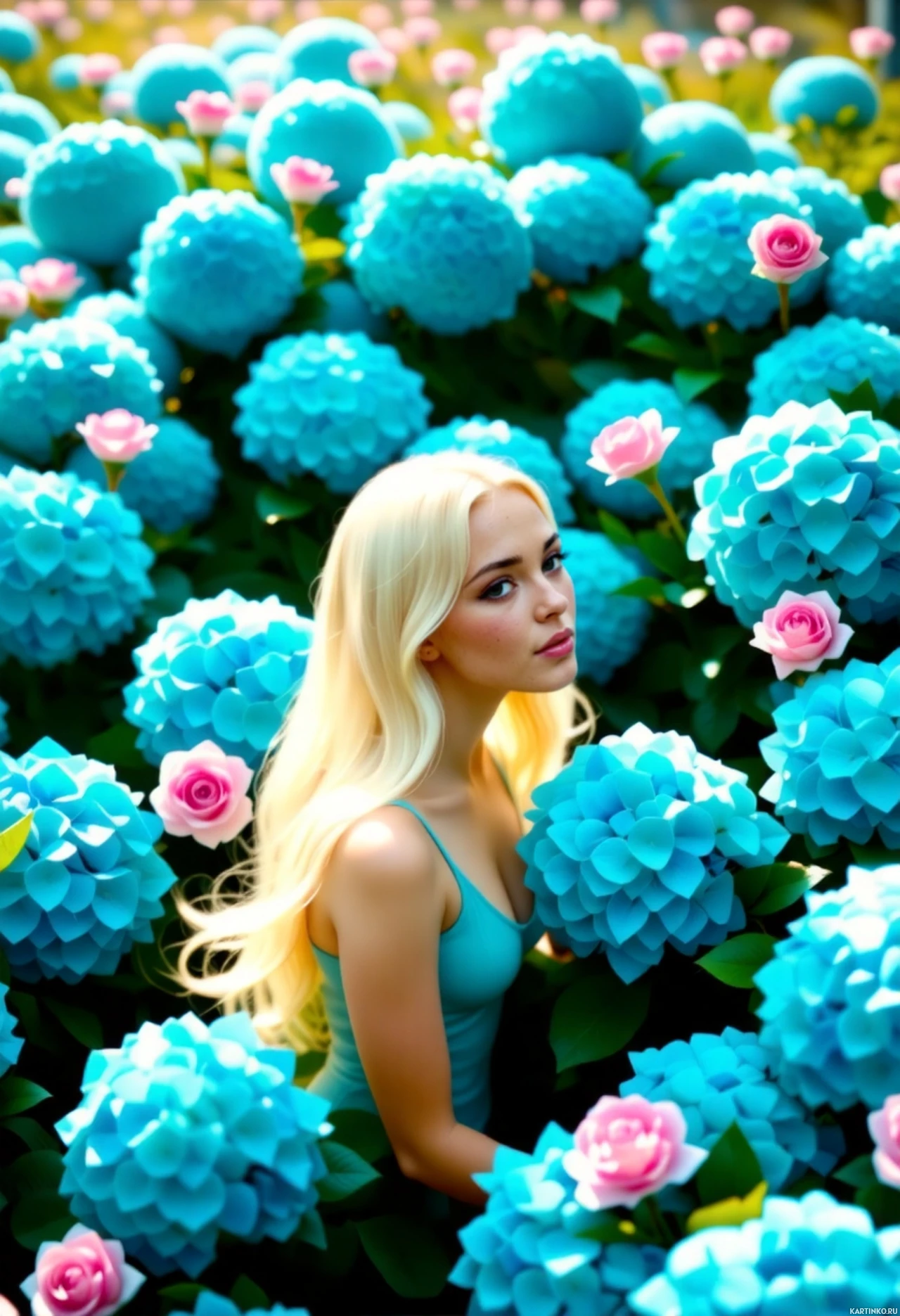 the vibrant colors of the flora. The woman is dressed in a light-colored top that blends with