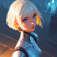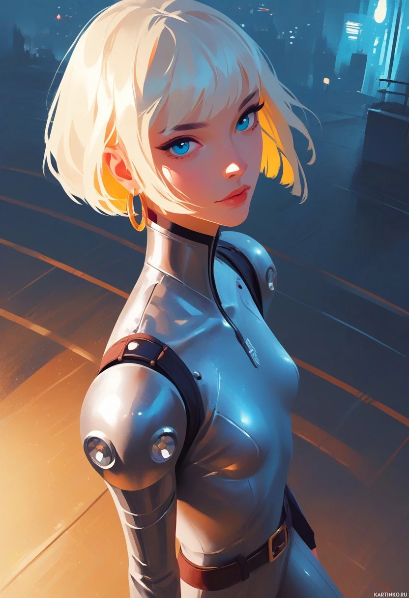 white hair and striking blue eyes. She has a youthful appearance but is dressed in a sleek, futuristic armor that suggests she might be from