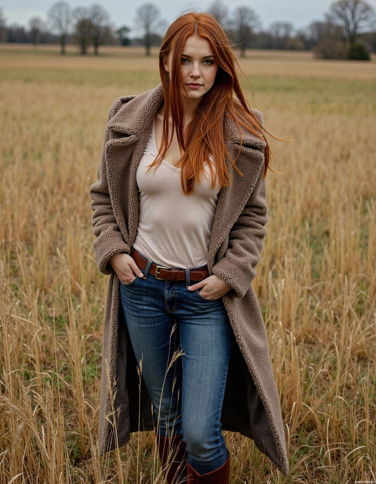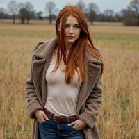 red hair is standing in an open field. She is dressed in a coat and jeans, giving off a casual yet stylish vibe. The woman's gaze is directed towards the camera, creating a connection with the viewer. The field around her appears to be harvested, suggesting it might be autumn or winter. The overall atmosphere of the photo suggests