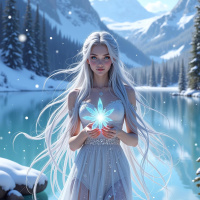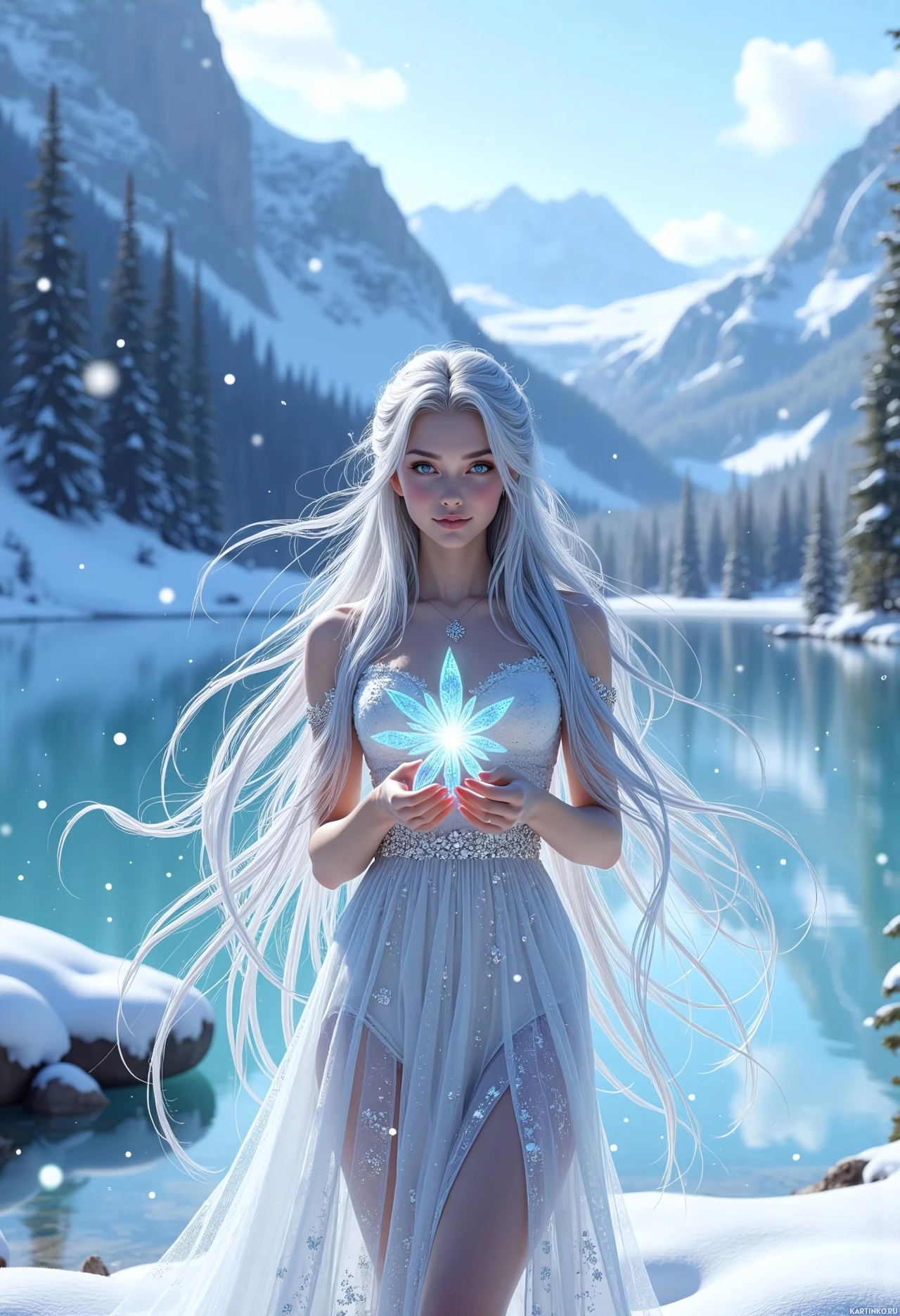 a young woman with white hair standing in a snowy landscape. She has an ethereal appearance, possibly due to her