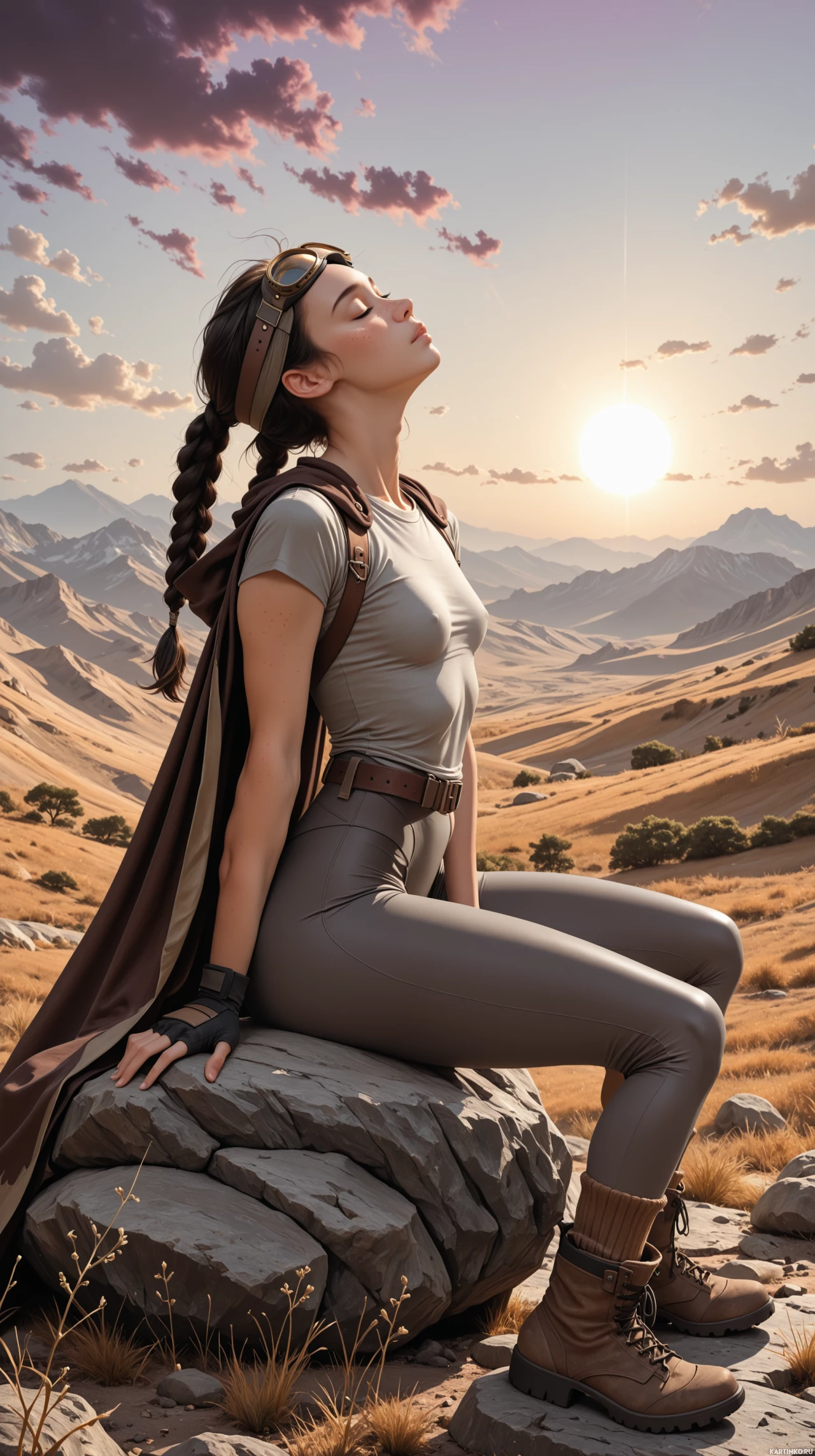 The image shows a person sitting on a rock with their legs crossed. They appear to be in
