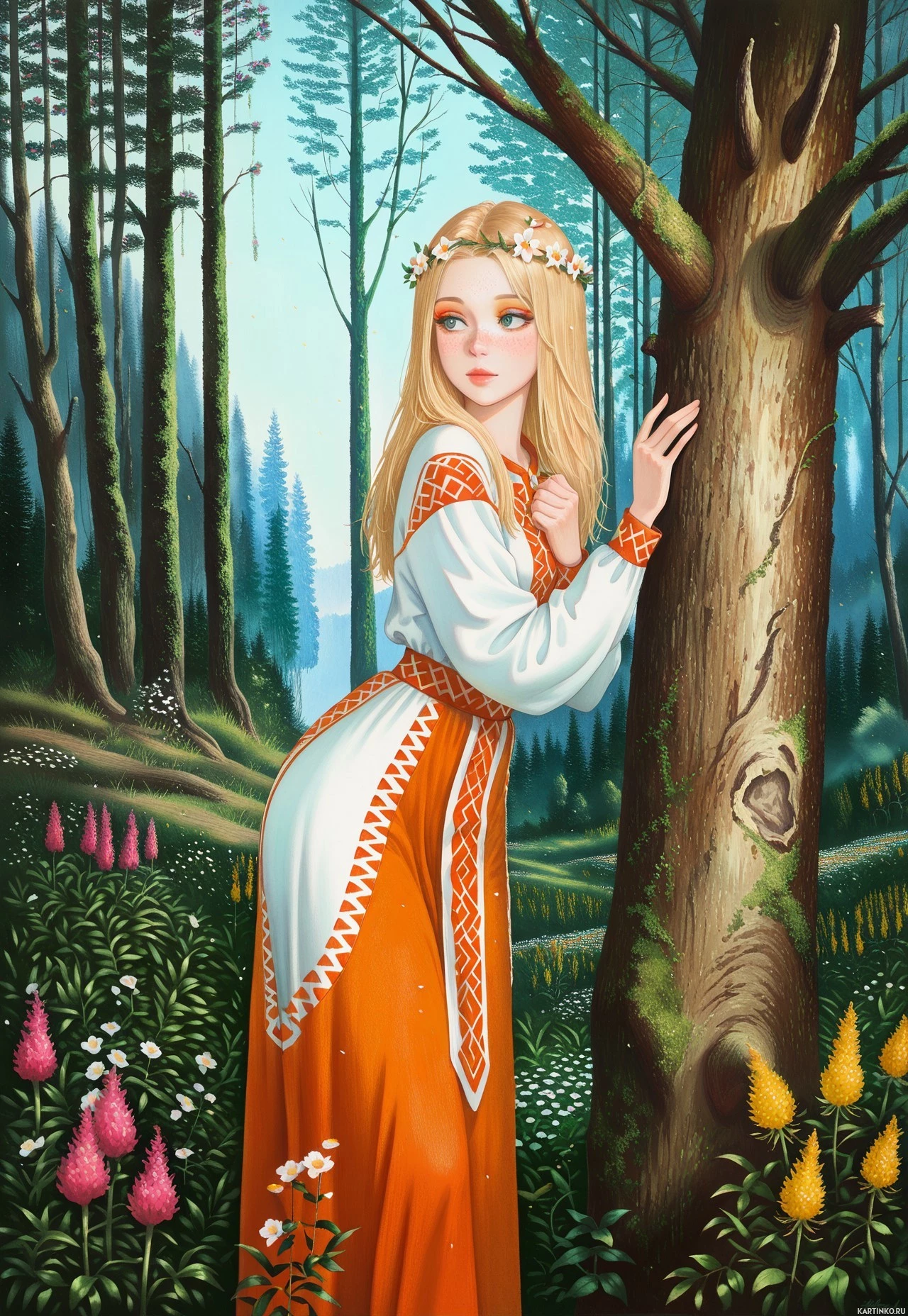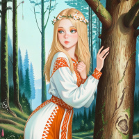 traditional clothing, which appears to be a folk costume, indicating a cultural or historical context. Her expression is one of contemplation or longing, as she gazes off to the side. The forest setting includes various types of trees and plants, suggesting