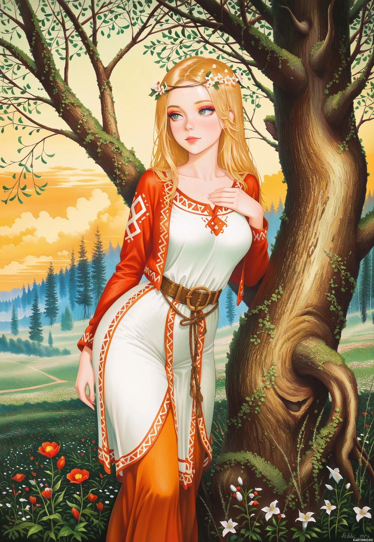 a blonde girl in a pastoral setting. She has long, wavy hair and is wearing