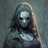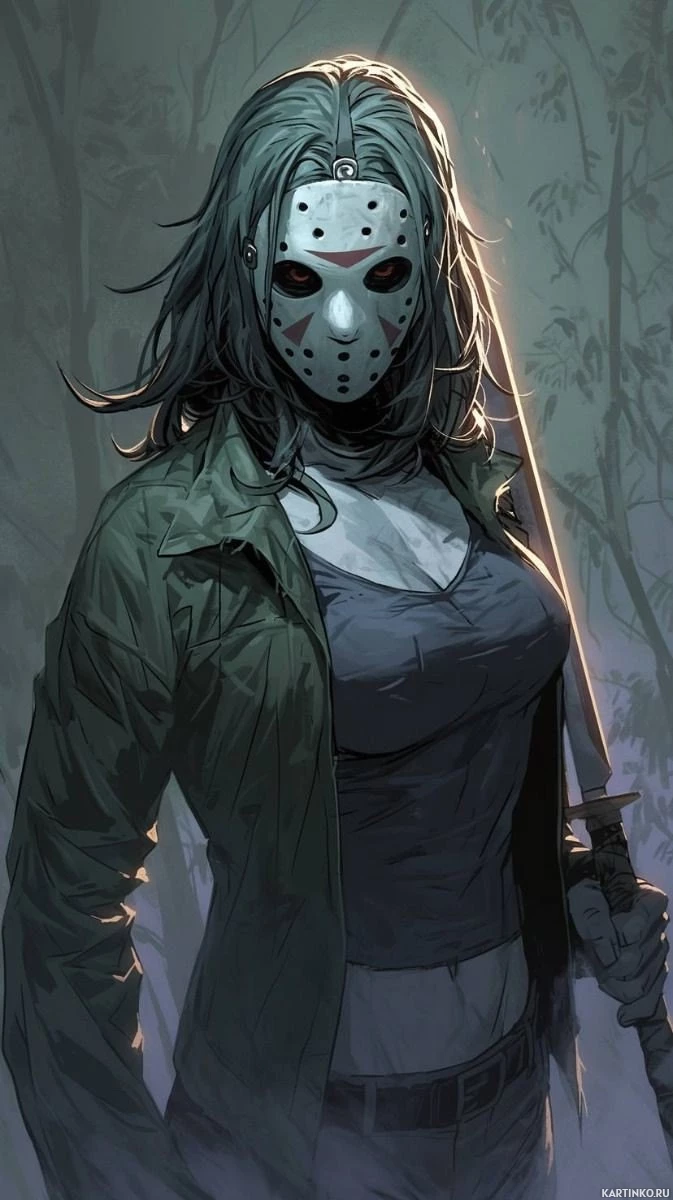 nose area, giving her a somewhat menacing or mysterious look. In one hand, she holds what seems to be a sword or a weapon of some kind. The background suggests a dark, forest-like environment with misty atmosphere, enhancing the moody and potentially suspenseful