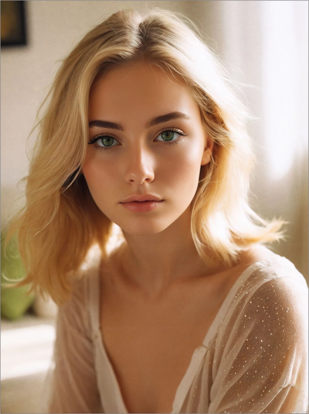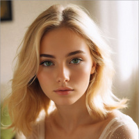 blonde hair looking directly at the camera. She has a light complexion and her eyes are of