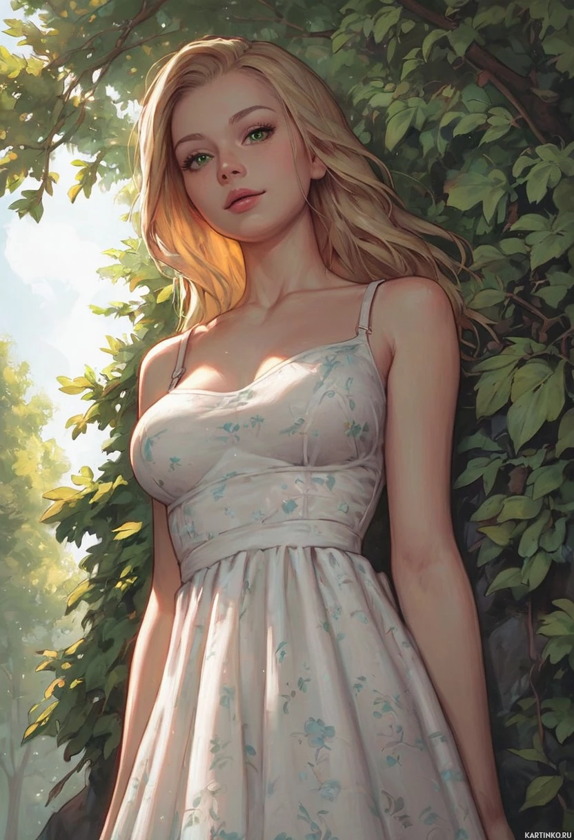 a natural environment, possibly a garden or forest, indicated by the presence of lush greenery and trees behind her. Her posture suggests she may be posing for the artwork, with one hand gently placed on the foliage while the other hand rests near her hip. The overall style of the image is illustrative, suggesting that this character might be from a fantasy or animated context.