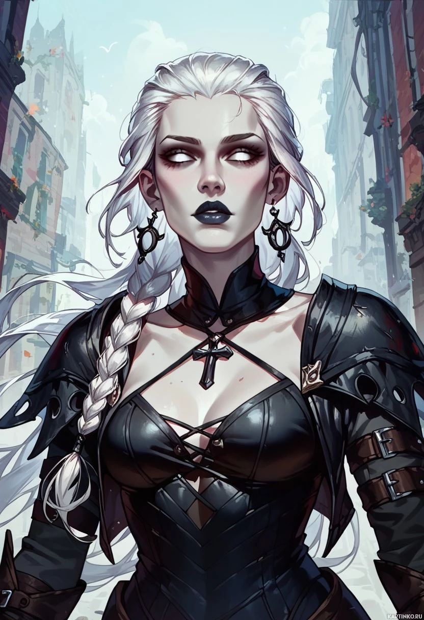 white hair and an intense expression. She has
