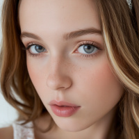 portrait effect. The background of the photo is neutral and does not distract from the subject. It's a soft, blurred texture that does not provide any additional context or information about the setting. Overall, the image presents a clean and elegant makeup look with a focus on natural beauty.