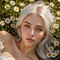 gentle smile. She is lying down on what looks like a field of wildflowers, with