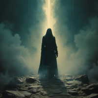 a hooded cloak, which obscures the face from view, adding an air of mystery. Surrounding this figure are several