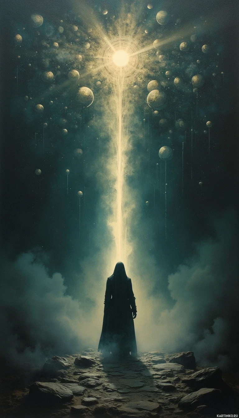 glowing orbs, and a beam of light that seems to be emanating from a central source not directly visible within the frame. The color palette is dominated by dark tones with accents of blue and green, which contribute to