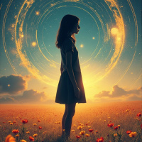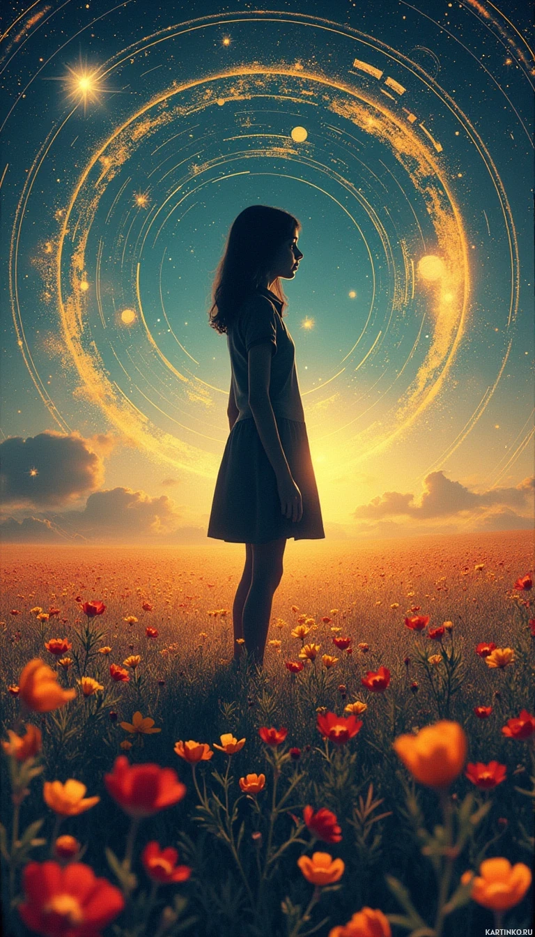 a circular design filled with stars and planets, suggesting an astronomical theme. The flowers around her are orange in color, adding vibrancy to the scene. The overall atmosphere of the image is serene and dreamlike, possibly evoking themes of wonder, exploration, or contemplation.