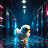 server room. The chicken is wearing sunglasses and is positioned in the center of the frame, looking towards the camera. The