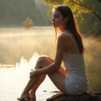 a young woman sitting on a rock near water's edge, facing away from the viewer. She is wearing a sleeveless