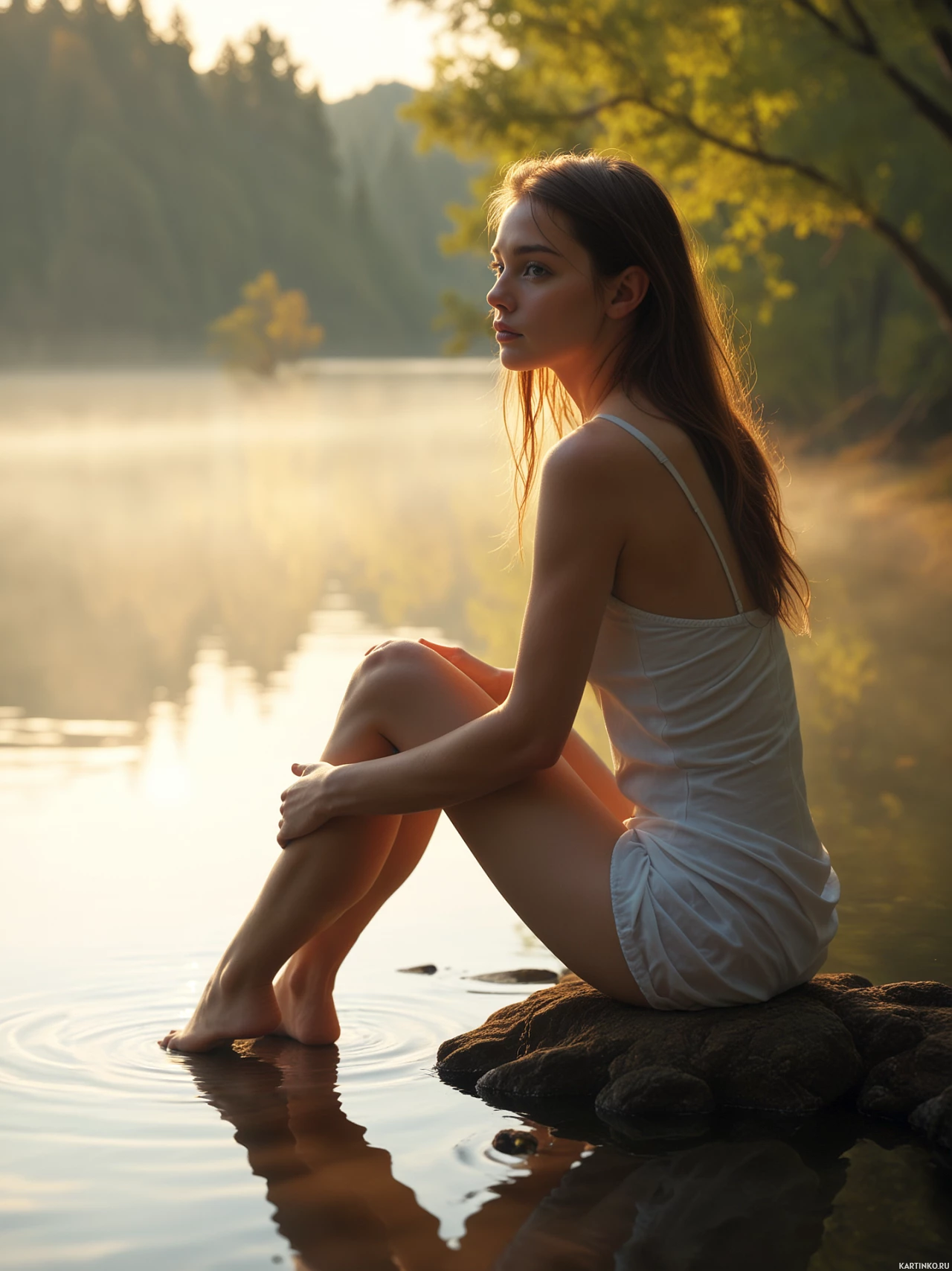 small ripples near the rock she is sitting on. There are trees lining the edge of