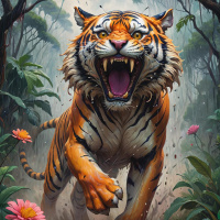 level of detail in the tiger's fur and the background elements shows careful attention to creating a lifelike representation of the scene.