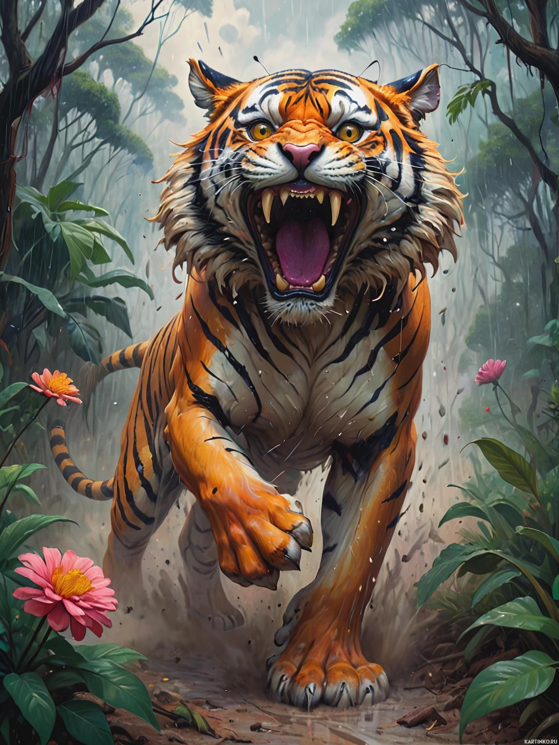 jungle setting. The tiger is captured mid-roar, its mouth open wide and its eyes focused intently ahead. It appears to be moving with some urgency, perhaps chasing or protecting something out of frame. The environment is richly detailed with