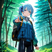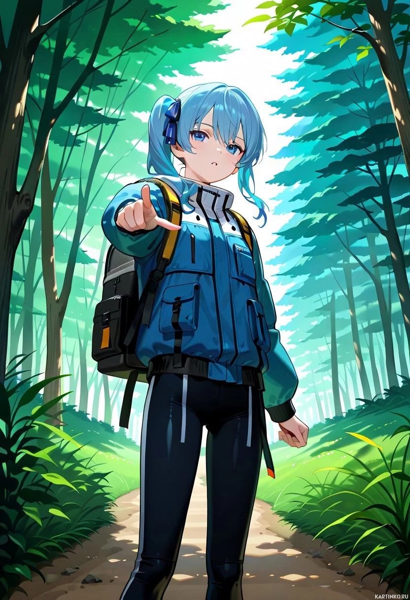blue hair and is wearing a backpack, suggesting she might be on a journey or adventure. The character is standing amidst