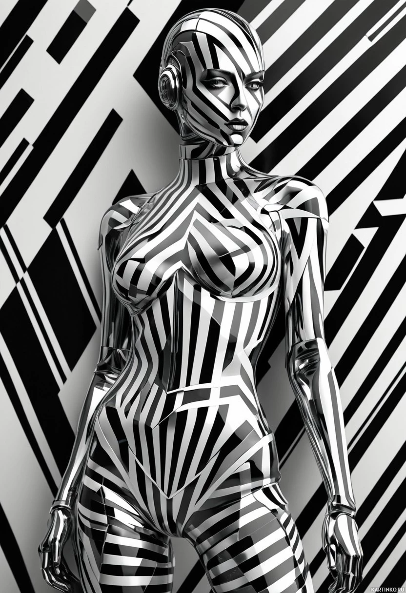 abstract designs with black and white diagonal stripes on a gray gradient backdrop. The figure's pose is confident and direct, with one hand resting on her hip and the other hanging by her side. Her face has