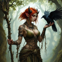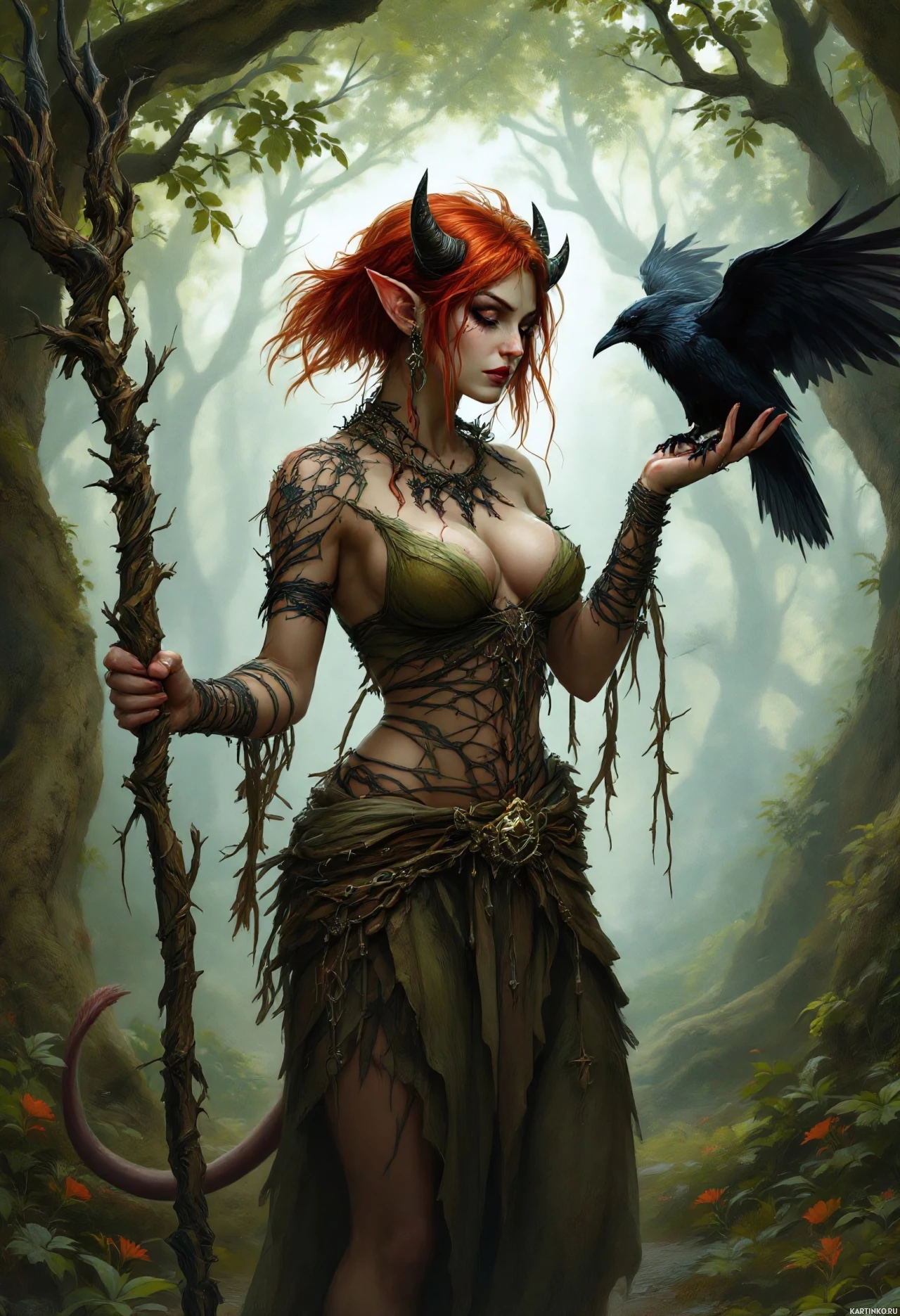 red hair and horns on her head, which suggest she might be depicted as a demon or a fantastical creature within the context of the image. The character is wearing a dress that looks like it's made from foliage or leaves, with elements that appear to be vines or roots. She also holds a staff in one hand and a bird in her other hand, implying a connection to nature or magic. The background of the image shows a misty