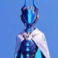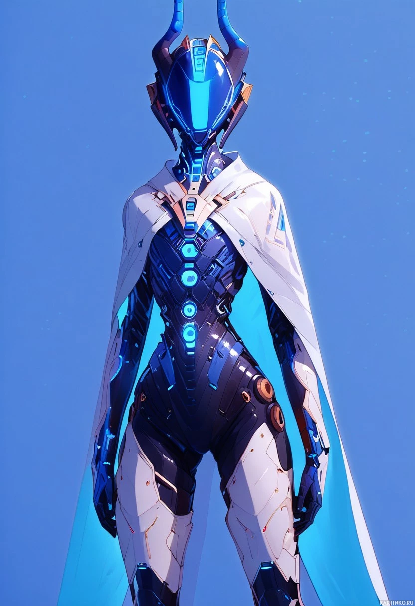 cloak drapes over one shoulder, adding to its futuristic appearance. The background is simple and unobtrusive, featuring a blue gradient that matches the color scheme of the character's attire.