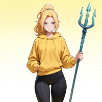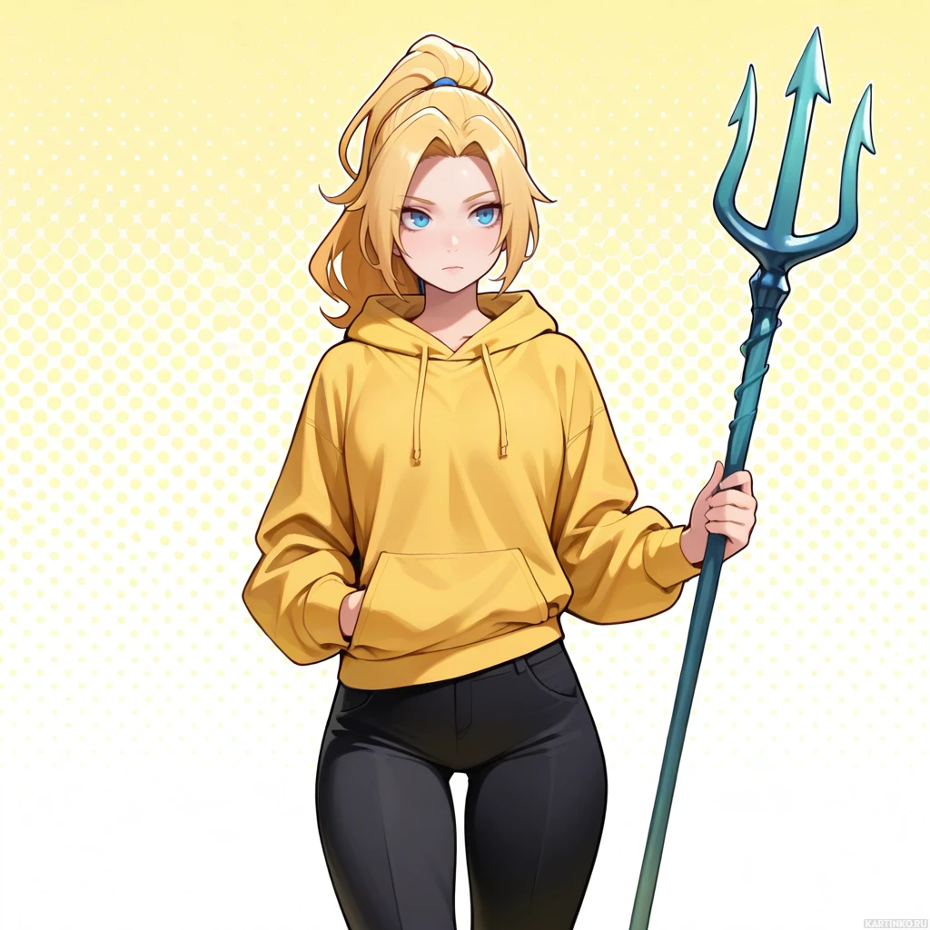 blonde hair and blue eyes. She is holding what appears to be an ornate spear or weapon that has a design similar to the Ancient Greek symbol of Poseidon, often associated with sea gods due to the trident
