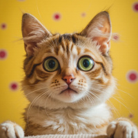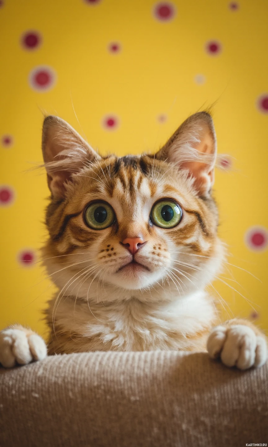 red spots, possibly from a polka dot pattern or wallpaper design. The kitten appears to be indoors and is seated on what seems to be a cushion or a piece of furniture with a grey-colored surface, providing a soft,