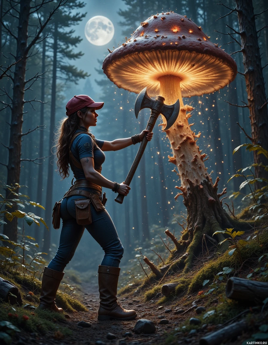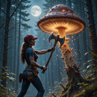 a female character, presumably from a fantasy or video game setting, standing in a forest at night. She is holding an axe in her right hand and appears to be striking the head of a large mushroom that has a glowing top, similar to those found in