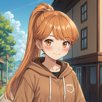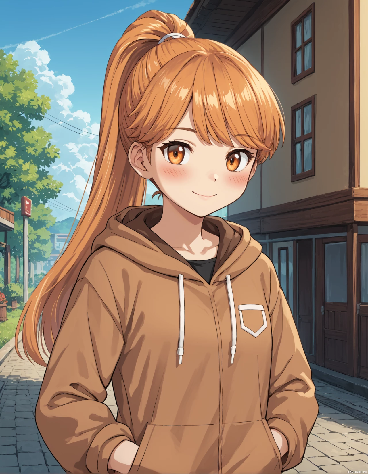 a brown hoodie with the hood down and her hands are resting on her hips. The background suggests a stylized, possibly fantasy-themed