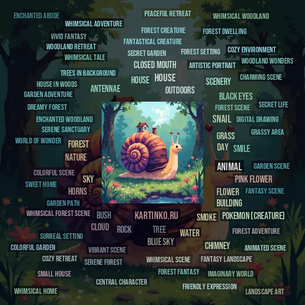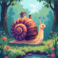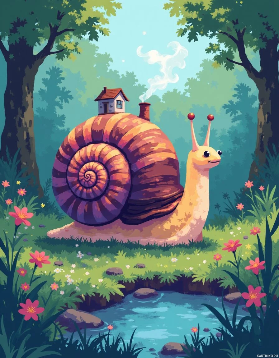trees in the background, along with what appears to be a small house or cabin with smoke rising from its chimney, suggesting a cozy and warm living environment for the snail. There are also flowers blooming around the scene, adding to the pleasant and serene atmosphere of the illustration. The image has been edited to enhance the colors and details, giving it a vibrant and charming quality that is appealing to viewers.