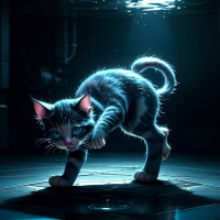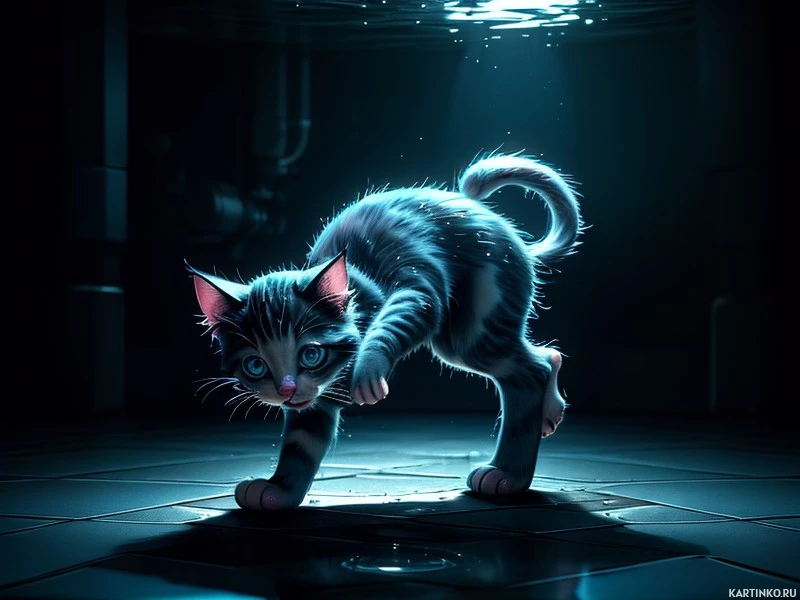 striped coat. The cat appears to be on a wet floor with a reflective surface that suggests it might be underwater or in a well-