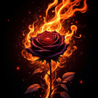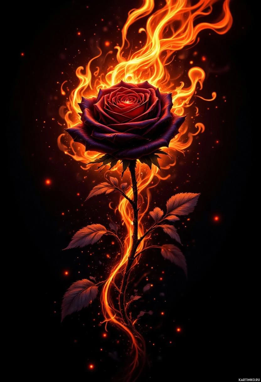 На картинке изображена одинокая роза, из лепестков которой вырываются языки пламени, создавая эффект огня. Роза темно-красного цвета и выделяется на фоне черного пространства, усыпанного маленькими искрами или звёздами. Общая композиция создает ощущение страсти или опасности, свойственное этому цветку.