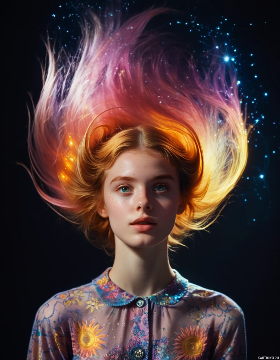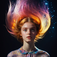 an ethereal expression on her face. From her hair, there appears to be a flame-like