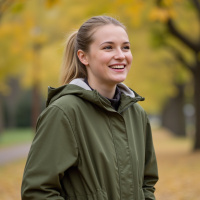 blonde hair tied back in a ponytail. Her expression is cheerful, and she is smiling at the camera. There are trees with yellow foliage behind her, suggesting it might be late afternoon or early evening due to