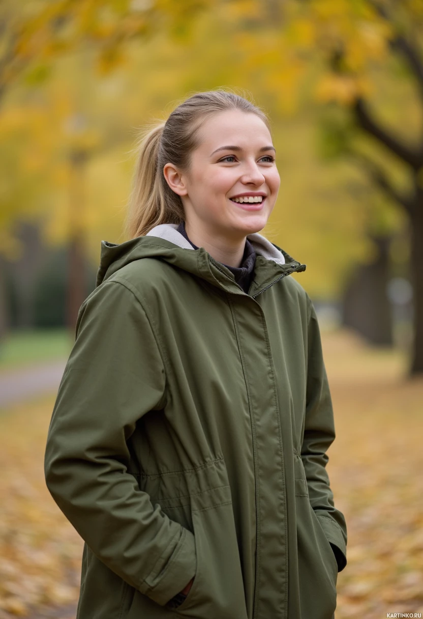 a young woman standing outdoors during autumn, as indicated by the fallen leaves on the ground. She is wearing a green raincoat and has