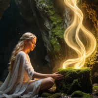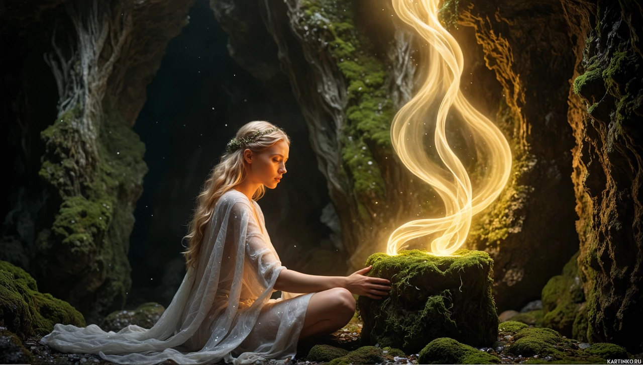 a small object she holds near her lap, which could be a candle, lantern, or some sort of magical artifact. The overall atmosphere of the image is serene and mystical.
