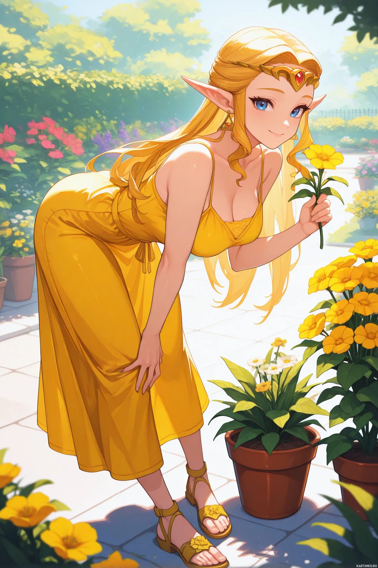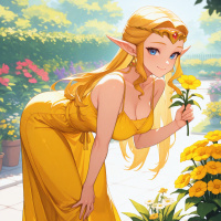 blonde hair, wearing a yellow dress and holding a small yellow flower. She is squatting down next to a row of