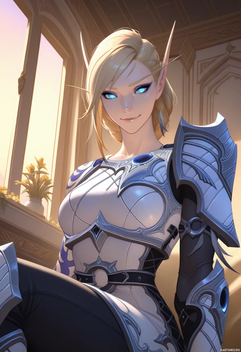 a female character with blonde hair and elven features, depicted in a fantasy setting. She has large