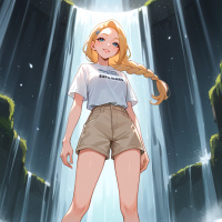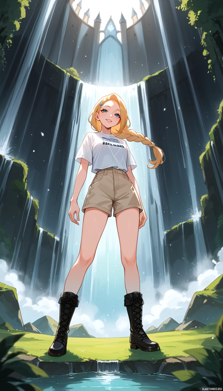 blonde hair standing in front of a majestic waterfall. She is wearing